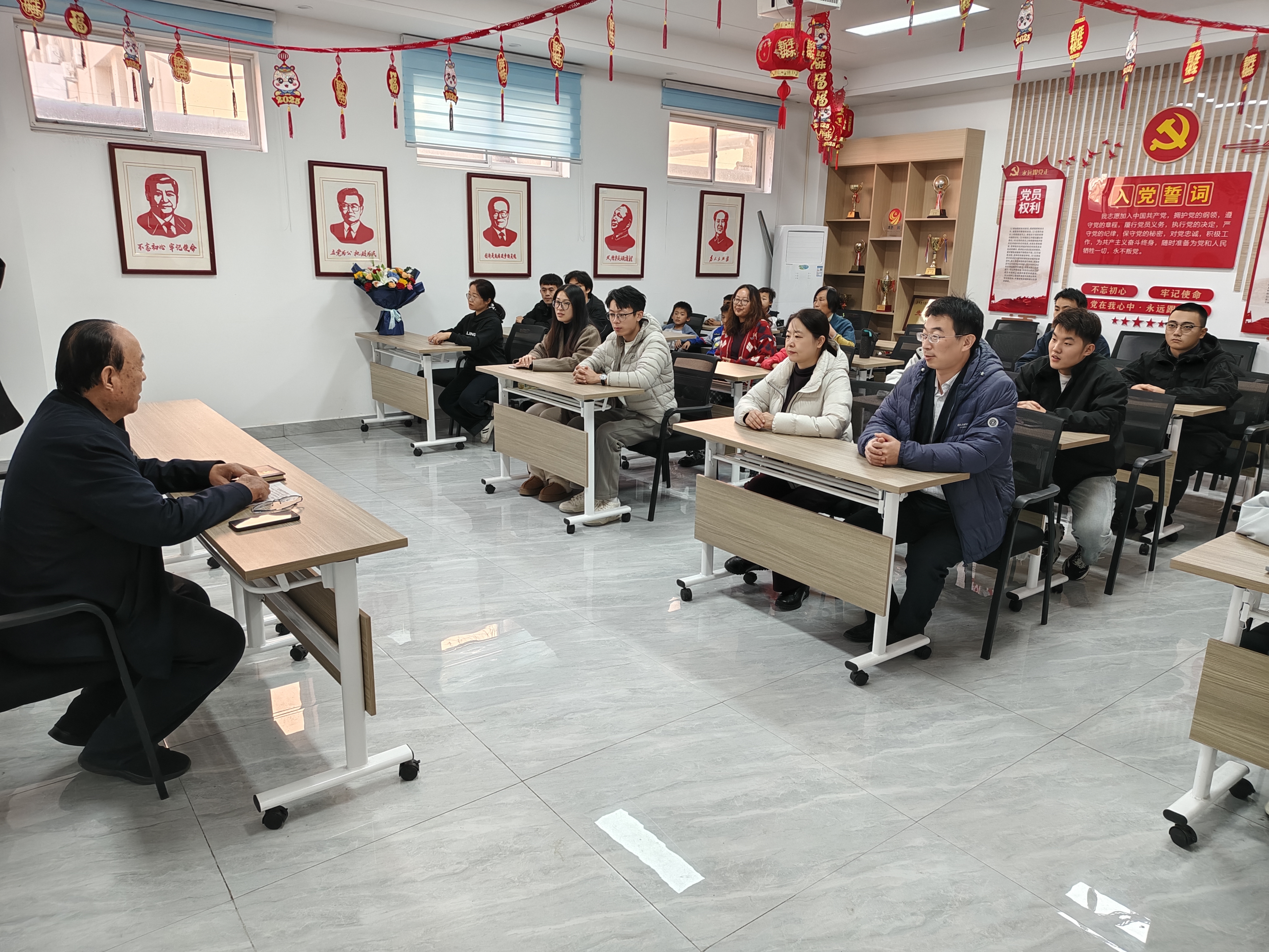 在学院东宿舍区活动室,我校离退休人员第一党支部书记褚守河通过宣讲红色故事、分享工作经历等形式,为学院青年师生讲授了一堂生动的思政课。褚守河作为学校发展的亲历者,结合自身成长经历畅谈国家发展巨变,围绕学校高质量发展生动讲述了学校发展变化的历程,勉励学生们要树立远大理想,珍惜当下、接续奋斗,将个人发展同国家战略需求紧密结合,长大后为祖国多做贡献。